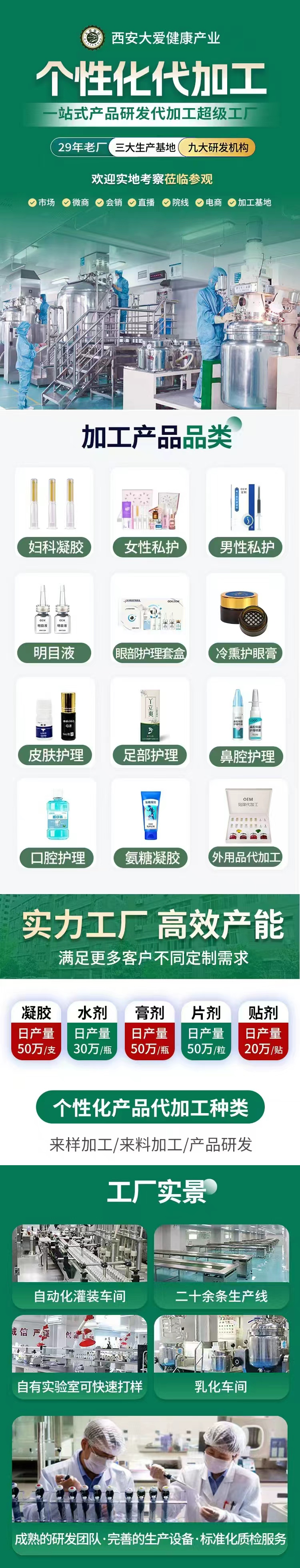 產(chǎn)品特點: 西安大愛健康產(chǎn)業(yè)有限公司是一家集科研、開發(fā)、生產(chǎn)、銷售于一體的綜合型現(xiàn)代化生產(chǎn)企業(yè),以生產(chǎn)消毒衛(wèi)生用品、日用品、醫(yī)療器械類為主的源頭工廠,提供配方設(shè)計、OEM、產(chǎn)品包裝等一站式服務(wù)。