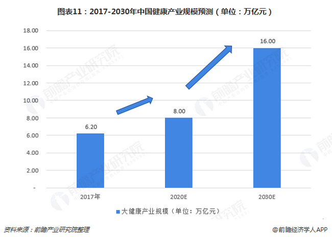 (3)健康產(chǎn)業(yè)規(guī)模顯著擴(kuò)大。建立起體系完整、結(jié)構(gòu)優(yōu)化的健康產(chǎn)業(yè)體系,形成一批具有較強(qiáng)創(chuàng)新能力和國際競(jìng)爭(zhēng)力的大型企業(yè),成為國民經(jīng)濟(jì)支柱性產(chǎn)業(yè)。到2020年,健康服務(wù)業(yè)總規(guī)模超過8萬億元,2030年達(dá)到16萬億元。